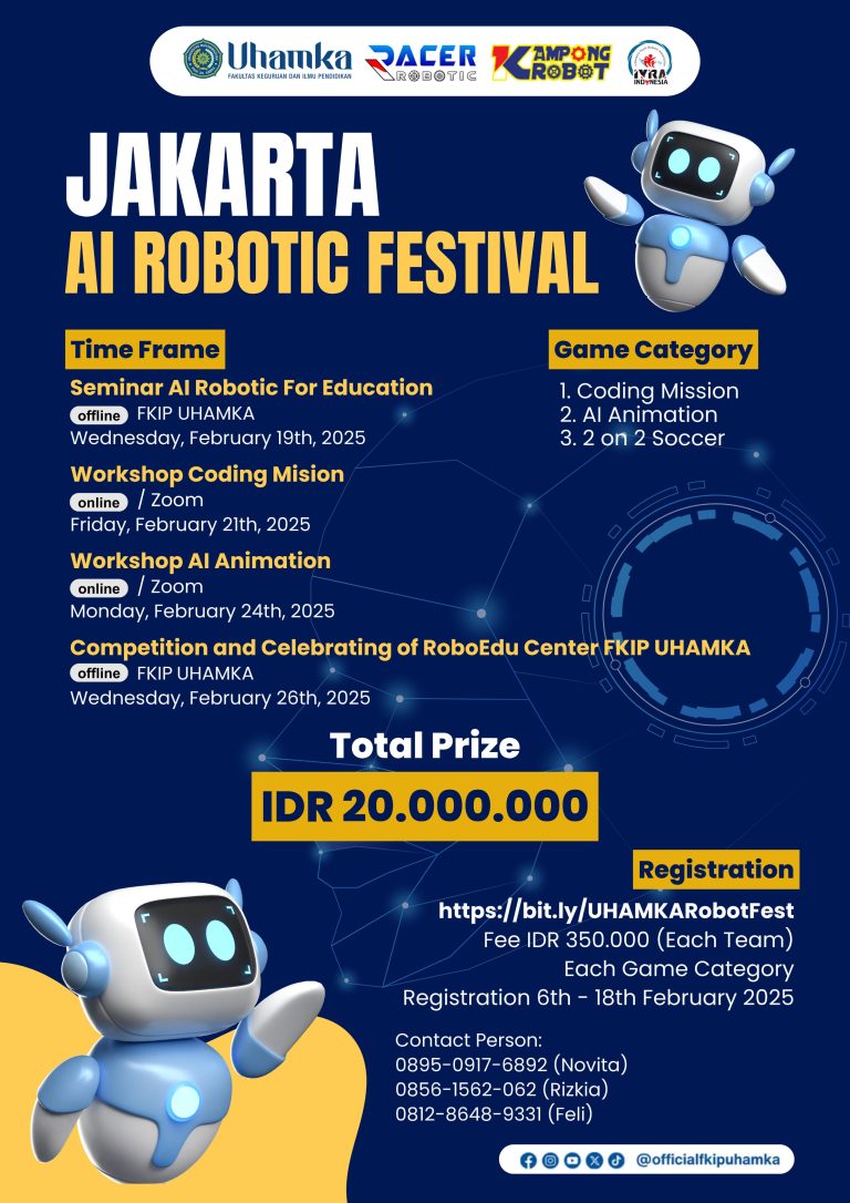 Fakultas Keguruan dan Ilmu Pendidikan (FKIP) Universitas Muhammadiyah Prof. Dr. Hamka (UHAMKA) kembali menggelar acara bergengsi, yaitu Jakarta AI Robotic Festival 2025. Festival ini diselenggarakan dengan tujuan untuk memberikan edukasi dan pemahaman yang lebih mendalam mengenai teknologi kecerdasan buatan (AI) dan robotika kepada masyarakat luas, sekaligus mendorong kreativitas dan inovasi di kalangan siswa, mahasiswa, dan masyarakat umum.